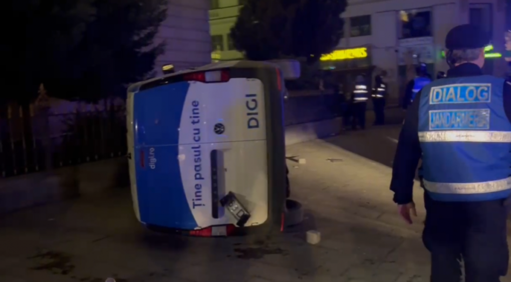 Poliţia Capitalei a deschis un dosar penal pentru distrugere, după ce o mașină a trustului Digi a fost răsturnată de „protestatari” azi-noapte, în zona Biroului Electoral Central