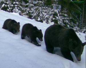 Doi cerbi tineri au fost surprinși de camera pentru monitorizarea faunei, măsurându-și forțele, în noul strat de zăpadă așezat în Parcul Natural Bucegi.